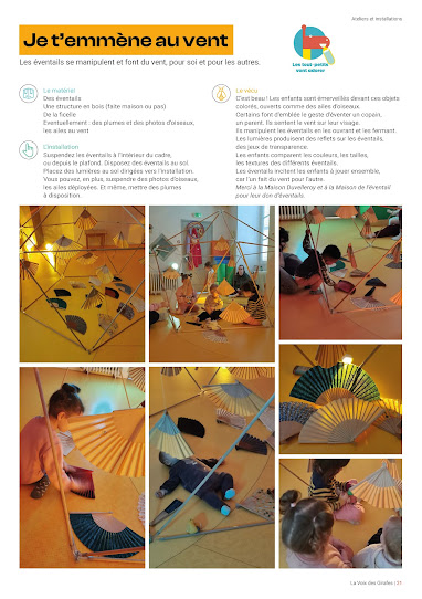 Les Ass'Mat de Roquecourbe et Lacrouzette ont proposé une 2ème matinée aux enfants à l'occasion de la Semaine Nationale de la Petite Enfance. Après "20000 lieues sous les mer" la semaine dernière elles ont cette fois proposé 2 activités en 1 ou presque : d'abord "Promenade Chromatique", puis, en se servant de l'installation déjà en place "Je t'emmène au vent". (clic sur les fiches pour les agrandir)