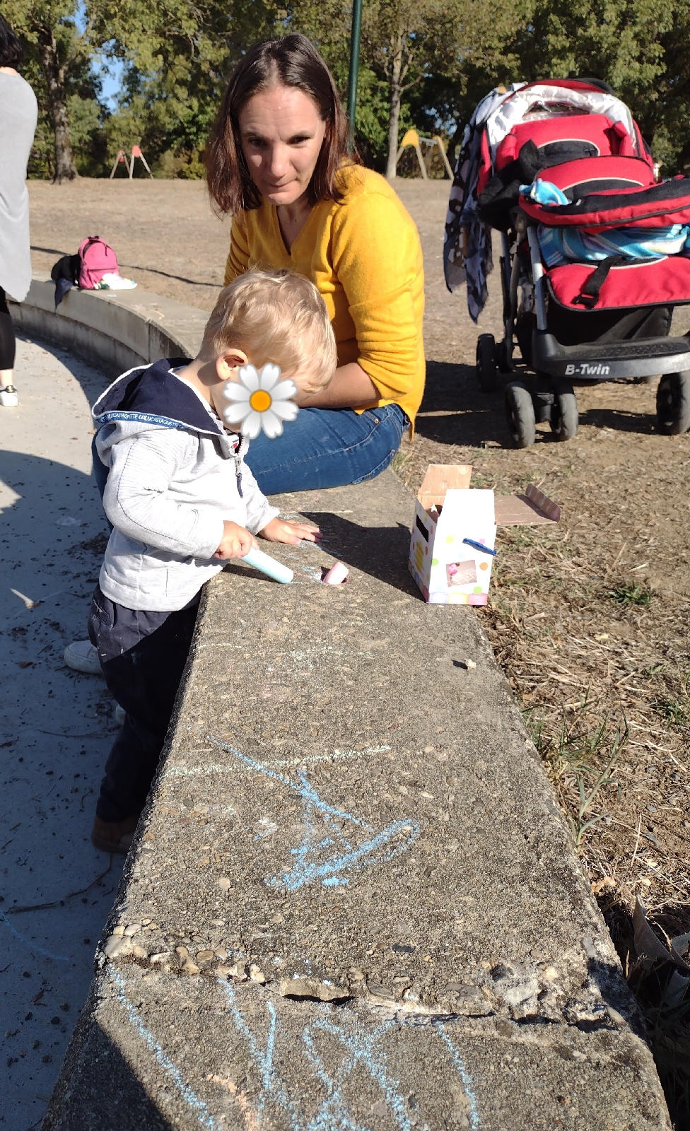 Quelques Ass'Mat de se sont retrouvées au parc de Gourjade pour un séance de coloriage un peu particulière : les enfants (et aussi les adultes il faut bien l'avouer !) ont colorié le bassin (une idée que d'autres ont eu avant elles et qu'elles ont décidé de reproduire). Les enfants furent un peu surpris, mais contents. Certains ont préféré colorier le muret plutôt que le fond, d'autres ont préféré frotter les dessins avec leurs mains ou colorier par dessus...