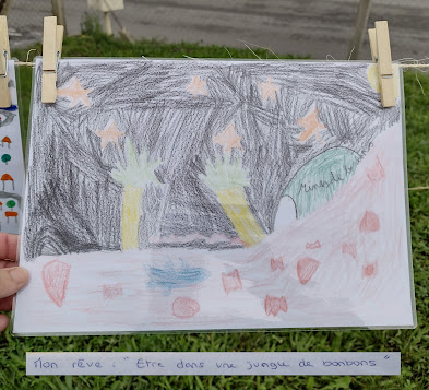 ... court.... parce de nouvelles œuvres allaient être à leur tour étendues, celles des enfants du centre du loisirs de la commune ! Au dos de chaque dessins une phrase descriptive... L'installation est restée en place jusqu'à 19h de sorte que les habitants ou parents rentrants du travail puissent s'arrêter et contempler...